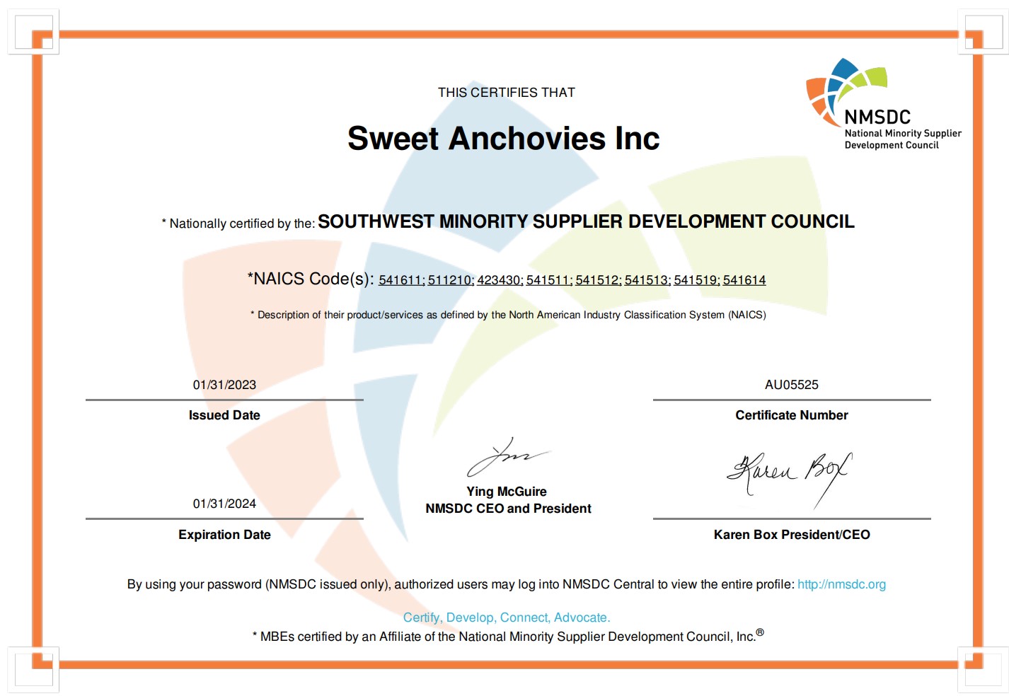The National Minority Supplier Development Council helps businesses and organizations be sure that the people they're dealing with are indeed minority owned. In our case, we are 100% minority owned. Here is a copy of our NMSDC MBE certification.